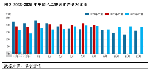 在投资回报率降低因素的影响下,己二酸产能投放趋于尾声,产能扩张有望迎来阶段性拐点。己二酸2025年其产能方面暂无新增产能出现,且部分工厂装置产线保持检修致市场现货投放量趋于稳定。卓创资讯统计数据显XM交易软件示,截至8月己二酸国内市场总产量或为160.81万吨,该数值较2023年同期高14.67%,但较2024年同期仅高0.98%。月度供应量来看,2025年前8月均值或为20.01万吨附近,该数值较202XM交易软件3年同期均值高14.14%,但较2024年同期均值仅高0.55%。行业新增产能投放对于市场供应端的冲击减轻明显。