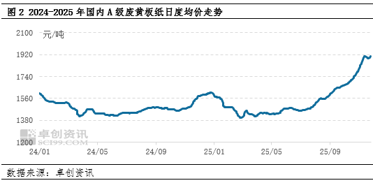 瓦楞及箱板纸主要生产原料以废黄板纸为主,配比XM交易软件可达85%以上。11月中上旬废黄板纸价格偏强运行,打包站回收量增量有限,惜售情绪仍存,下游纸企库存水平不高,备货意向较稳,废黄板纸采购价格继续上调,刷新年内高点。下旬受打包站高点出货因素影响,纸企废黄XM交易软件板纸到货量增加,采购价格小幅回落,跌幅有限。据卓创资讯监测数据显示,截至11月26日,中国废黄板纸市场均价为1880元/吨,环比上涨8.58%,同比上涨23.94%。综合来看,废黄板纸月内均价继续上涨XM交易软件,成本面对于瓦楞及箱板纸价格底部支撑作用依旧较强。