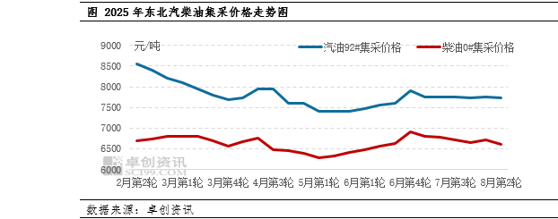 如上图所示,进入7月份汽油集采成交价格横盘整理,持续位于7700元/吨上方波动,汽油消费处于季节性旺季,尽管汽油需求增量有限,但需求边际改善形成提振,8月份汽油集采价格先涨后跌,但是基本盘XM交易软件面相对稳定,集采价格波动有限。7月份柴油集采价格自6月创下的高点回落,8月第一批短暂反弹但是基本面承压,缺乏需求支撑加上原油价格回落,柴油市场基本面表现脆弱,柴油集采价格跌至7月份以来的低点。从汽柴油XM交易软件集采价格走势分析,对短期汽柴油市场起到利空指引,从近期线性波动趋势看,或形成了市场底部波动区域。