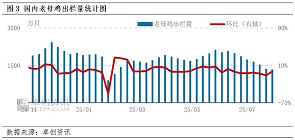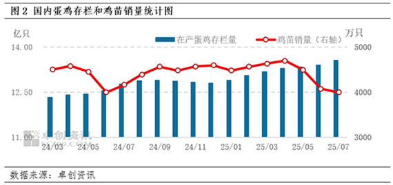 补栏量大于待出栏量,主产蛋鸡存栏占比继续扩张。7月120-450日龄的主产蛋鸡存栏主要受到7月新开产蛋鸡数量(3月补栏鸡苗)以及7月进入待淘汰群体的蛋鸡数量(2024年4月鸡苗补XM交易软件栏量)影响。通过图2可以看出2025年3月鸡苗销量和2024年4月鸡苗销量均有提升,但2025年3月鸡苗销量增幅较大,导致7月主产蛋鸡存栏占比扩张,环比继续提升0.16个百分点。