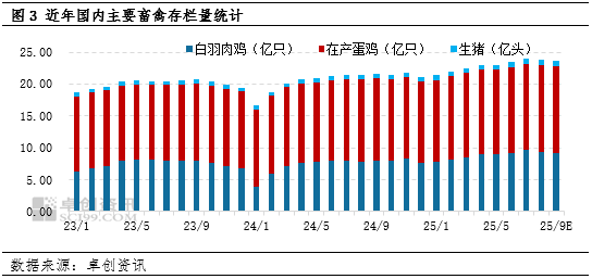 由于9月份受到开学季、中秋节需求拉动,畜禽产品行情上涨概率较大,畜禽行业存在集中出栏的习惯。卓创资讯预计9月份国内主要畜禽存栏量将降至23.62亿,环比降幅0.85%。其中,XM交易软件白羽肉鸡、在产蛋鸡均有不同程度下降,生猪存栏量环比增幅2.02%。由于新季玉米存在后熟期,畜禽养殖对陈粮仍有一定刚需,但难敌供应偏宽松的压力。