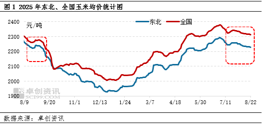 进入8月份,东北市场轮换粮持续补充,叠加产区贸易商积极出库,供应端略显宽松,但需求端处于季节性低位,市场价格承压缓慢走低。卓创资讯监测数据显示,截至8月22日,东北玉米市场日均价由22XM交易软件52元/吨跌至2230元/吨,跌幅0.98%,并未出现去年同期的“翘尾”行情。去年8月下旬至9月初东北市场价格小幅反弹的主要原因是期货盘面上涨提振市场情绪,产区贸易商惜售。(备注:玉米市场对于“翘尾”XM交易软件的理解是小幅反弹,而非金融领域的“上年年末的上涨因素对第二年的影响”)