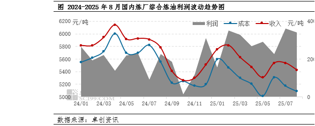 2025年8月,国内炼XM交易软件厂综合炼油利润为341元/吨,环比降低22元/吨,降幅为6.08%;同比提高114元/吨,涨幅为50.13%。8月炼厂平均理论炼油利润较去年同期仍较好,但较上月小幅降低。