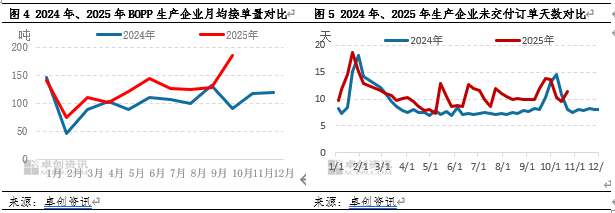 2025年需求端向好也为毛利提升提供强大助力。从调研的20家BOPP样本企业的月均接单量及未交付订单天数来看,2025年XM交易软件订单释放量较去年有较为显著提升。上半年在“关税、反内卷、中东局势紧张引发原油宽幅上涨”的宏观提振下,BOPP下游备货量提升,“金九银十”旺季终端需求好转,BOPP市场交投活跃。生产企业未交付订单天数多XM交易软件数时期维持在8-12天附近。