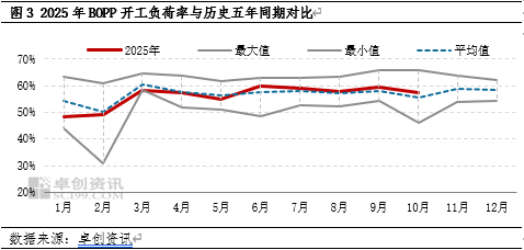 2025年1-10月BOPP行业新增7条生产线,扩能脚步较原计划放缓,且4条产线为下半年才陆续投放市场。其次春节前后、五一、国庆中秋等节假日生产企业主XM交易软件动停机比例提升,尤其是1-2月,开工负荷率降至50%以下,有效的控制了库存压力。
